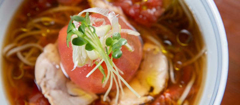 ねぎぼうずのメニューは、地元産のそば粉や地元の食材など、食材にこだわって考案しています。こちらは県内生産量1の大蔵トマトと大蔵村産の最上早生(蕎麦の品種)の「大蔵トマトと十割そば」です。